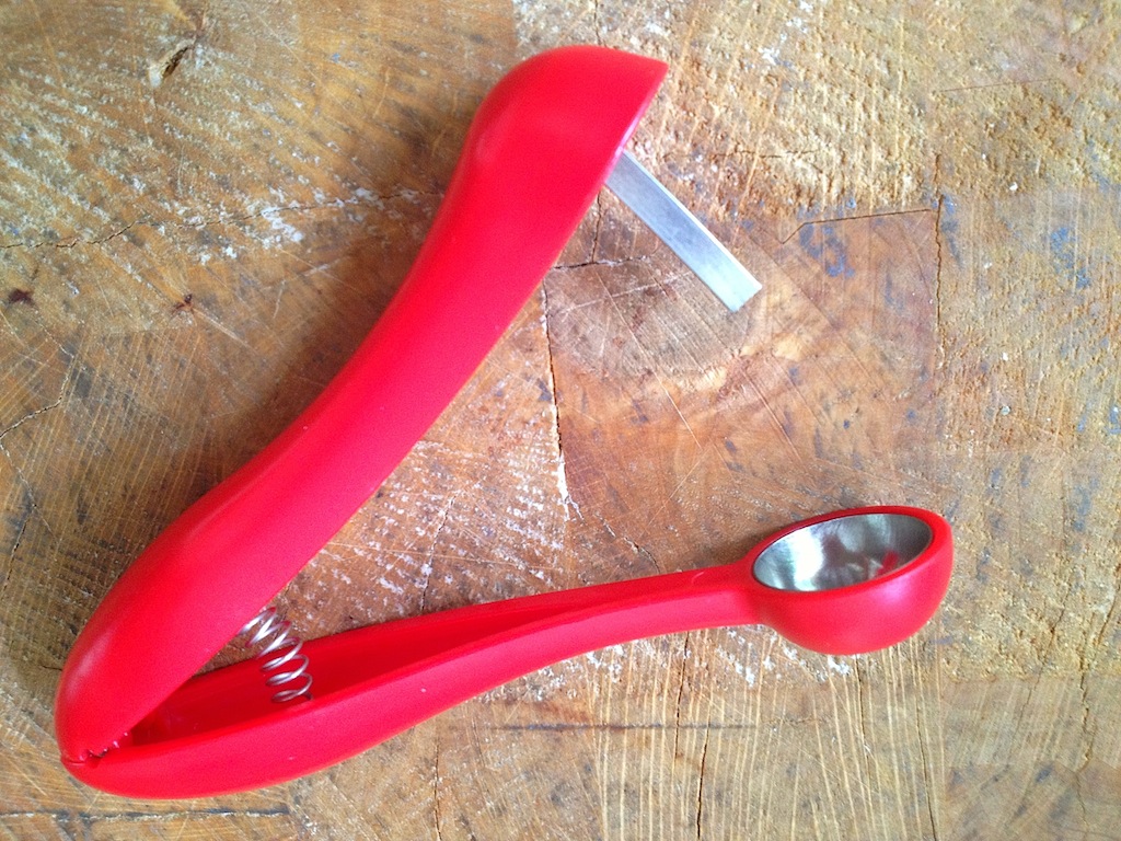 Oh ja, bij het ontpitten van de kersen kan er nog wel eens wat sap uit de kers komen dus draag niet je nette witte shirt. Om vlekken te vermijden hou ik mijn handen laag in de wasbak en sluit mijn hand om de kers en ontpitter.