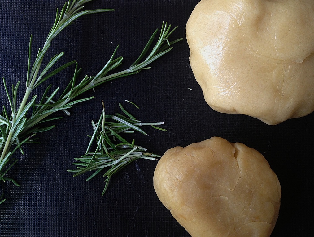 Halveer het vanillestokje in de lengte en schraap het merg eruit. Meng het merg met de bloem en het zout. Kneed de boter met de poedersuiker en de eidooier, voeg de bloem toe en kneed tot een soepel deeg. Kneed als laatste de rozemarijn door het deeg. Verpak het deeg in plastic folie en laat 30 minuten in de koelkast rusten.
