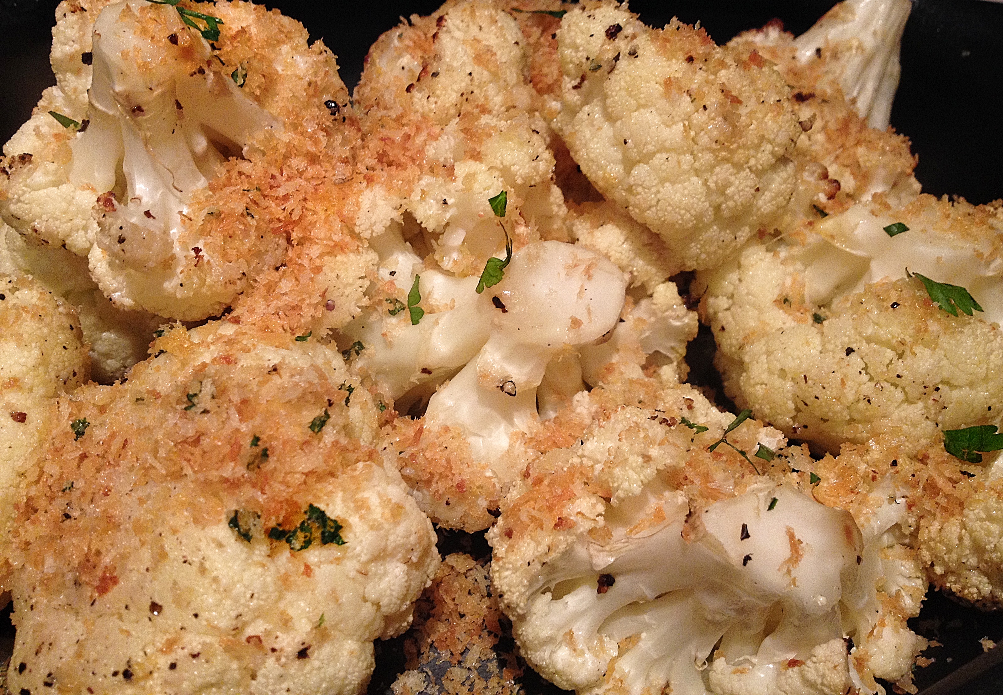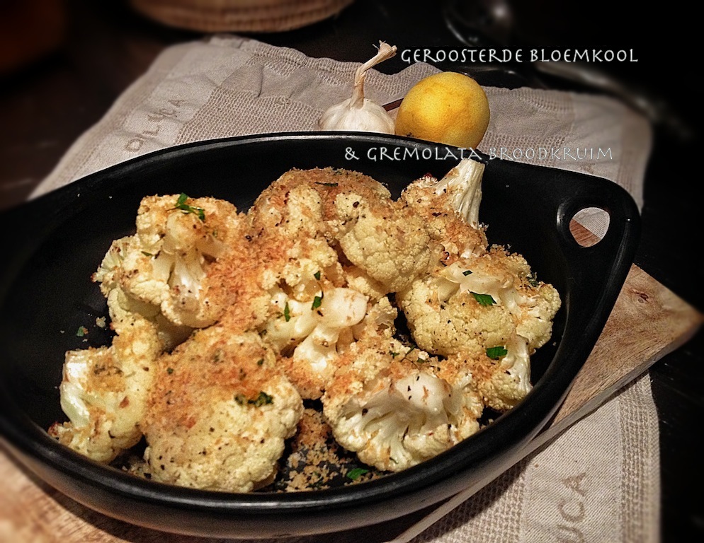Nu niet meteen wegklikken als je geen liefhebber bent van deze groente! Geloof het of niet, maar ik hou niet van bloemkool. De geur, smaak en textuur van gekookte bloemkool doen het niet voor mij. Totdat ik dit recept vond op TheThinChef. Door het roosteren van deze groente komen de natuurlijke zoetstoffen vrij, blijven de roosjes lekker knapperig en is de laffe bloemkoolsmaak verdwenen. De gremolata is een verrassende smaakmaker en past perfect bij de zoete bloemkool roosjes. De geur in je keuken is werkelijk verrukkelijk als de zest en knoflook in de pan met de Panko gaan. Met zekerheid kan ik beloven dat je dit gerecht ook op tafel kunt zetten voor de mensen die niet van bloemkool houden.