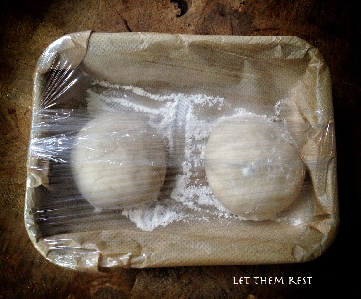 Bestuif het aanrecht met wat meel. Verdeel het deeg in twee gelijke delen en vorm en 2 stevige ballen van. Leg ze op een met bloem bestoven bakpapier en bedek met keukenfolie of plastic zak.