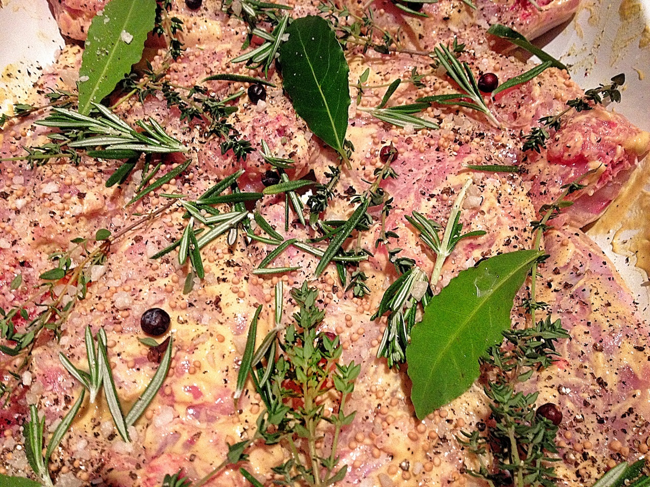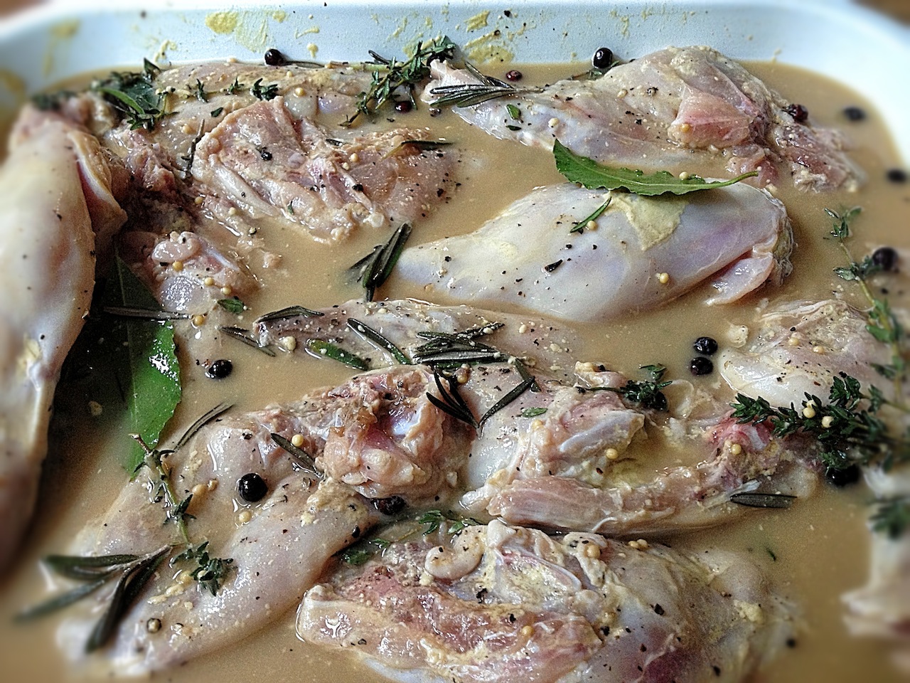 1. Rub the rabbit legs with salt, black pepper and the mustard. Put them next to each other in a large bowl and divide the Juniper berries, Cloves Thyme, Rosemary and bay leaves over the rabbit legs.