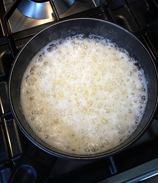 2. Zodra de suiker helemaal is gesmolten en je een heldere siroop hebt, voeg je de boter toe. Zet vuur ietsje hoger zodat het kookt en er een mooie goud bruine karamel kleur ontstaat. Hierbij heb je geduld nodig, want het duurt even voordat de karamelkleur gaat ontstaan. Let op: niet meer roeren als het kookt!