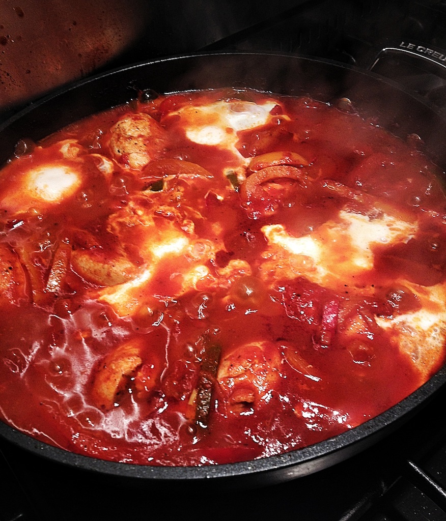 De kipfilet kun je vervangen door eieren. Maak een kuiltje en breek de eieren boven de pan, deksel erop en laat rustig gaar worden, maar laat de dooier niet gaar worden!