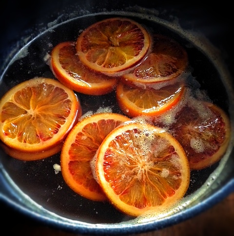 3. Doe de sinaasappelschijven bij de siroop en breng aan de kook. Zet het vuur laag en laat de siroop zachtjes sudderen tot de sinaasappelschijven zacht en doorzichtig zijn geworden en de siroop is ingedikt. Blijf af en toe roeren, keer de sinaasappelschijven ook om, en voeg evt water toe als de siroop te dik wordt. Na ongeveer 35 minuten is de siroop klaar.