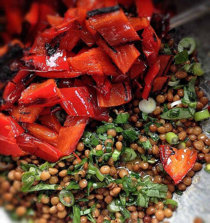 3. Snij de gegrilde paprika’s in stukjes en voeg samen met de cranberries toe aan de salade.