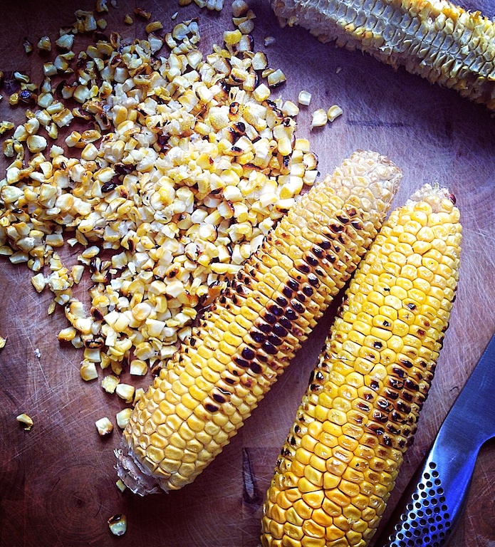 1. Verwijder de haren van de maïskolven, was ze goed en ldep ze droog. Zet de grillpan aan en laat in 5 minuten de pan goed heet worden. Leg de maïskolven erop en draai ze regelmatig om tot ze rondom bruin geroosterd zijn. Op de BBQ kan ook, maar zo op de plaat gaat prima en sneller.