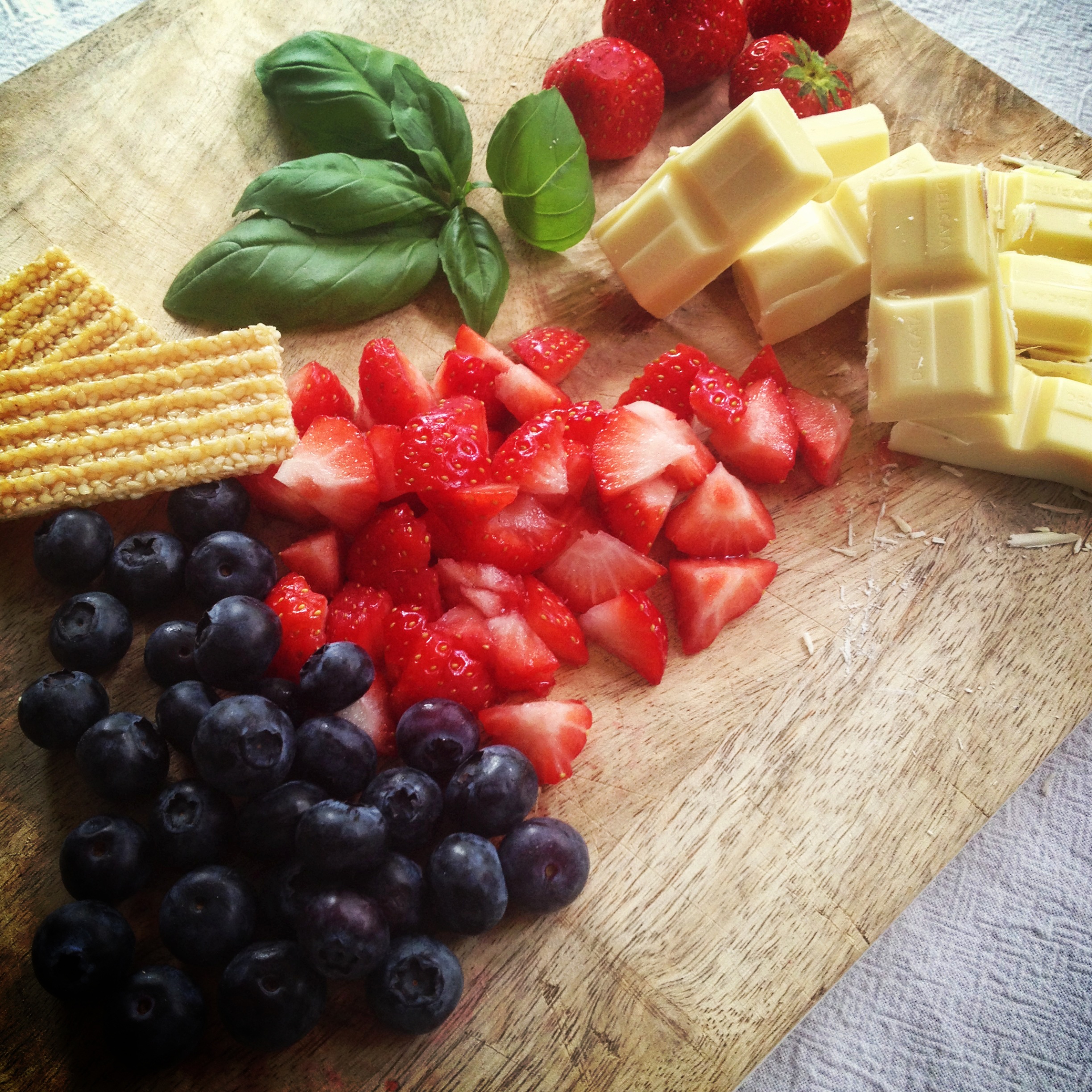 3. Snij de basilicum blaadjes heel fijn. Voeg toe aan de chocolade samen met de biscuits, sesam koekjes en fruit. Met alles goed door elkaar.