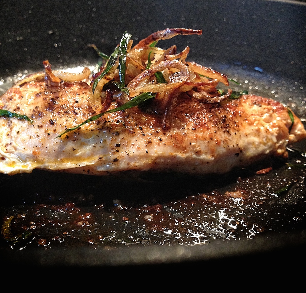 1. Verhit de pan en laat de boter zachtjes bruin worden. Kruid de kipfilet met zout, verse peper en paprikapoeder en bak rondom bruin op een laag vuur.