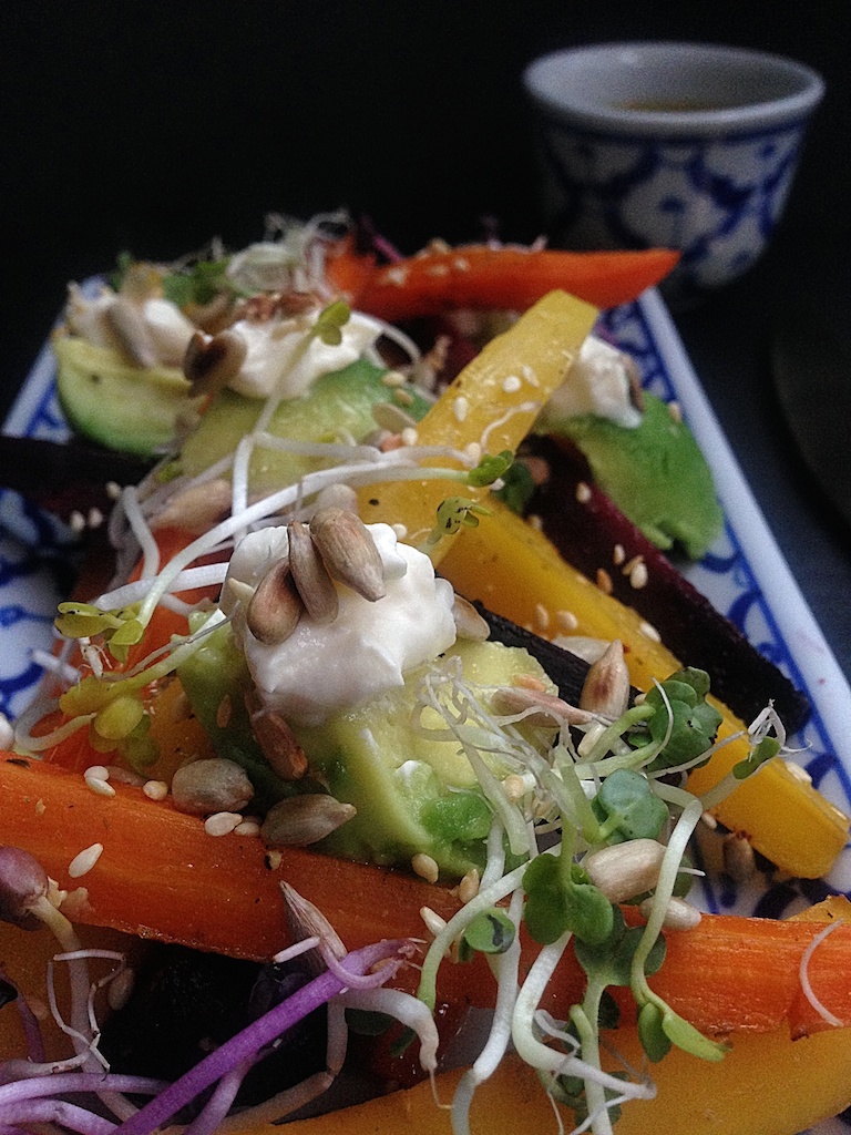 Worteltjes vind ik meestal niet zo lekker als ze warm zijn, maar dit gerechtje vaagt die mening in 1 keer weg. De citrusdressing maakt het lekker fris en past heel goed bij de lauw warme wortels. Samen met de knapperige zonnebloem- en sesamzaadjes, zachte avocado en de romige crème fraîche is het echt smullen. Voor mij is het een absoluut blijvertje. Dit gerecht komt uit ‘Serious Eats’, maar wel aangepast naar mijn smaak. Ik hou van een volle smaak en de dressing daarop aangepast. A perfect Delight! ♥