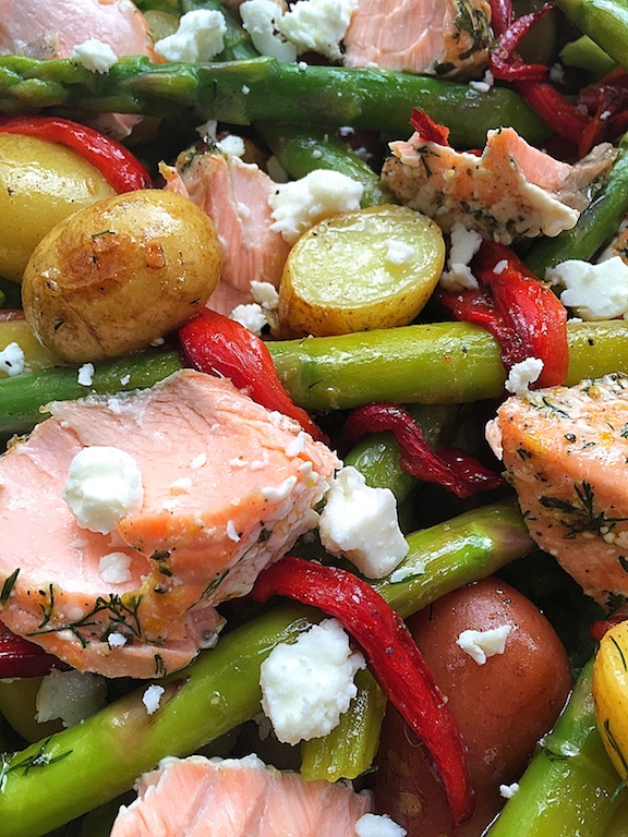 Meng de andere helft van de dressing door aardappeltjes en de asperges. Meng het gewoon met je handen en verdeel het over de Romaine sla. Breek de zalm erover en maak af met de rode paprika reepjes en verkruimelde feta.