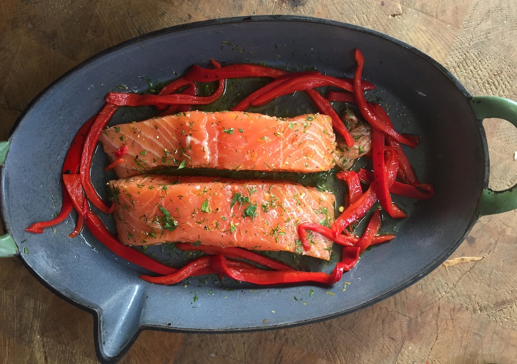 - Verlaag de oven temperatuur naar 160C. Doe de olijfolie, citroen zest, oregano, dille zout/peper in een ovenschaal en roer door elkaar. Wrijf de zalm er goed mee in. leg de paprika reepjes om de zalm. Bak de zal ongeveer 20 minuten.