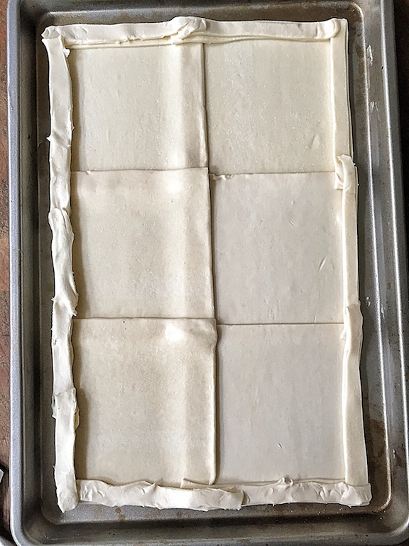 - Bedek de bakplaat met bakpapier en leg de ontdooide plakjes bladerdeeg op het bakpapier. Zorg ervoor dat de plakjes een beetje overlappen. Maak smalle reepjes van een ruime centimeter en leg deze op de rand van het bladerdeeg. Zo ontstaat straks een opstaand randje. Prik gaatjes in het deeg.