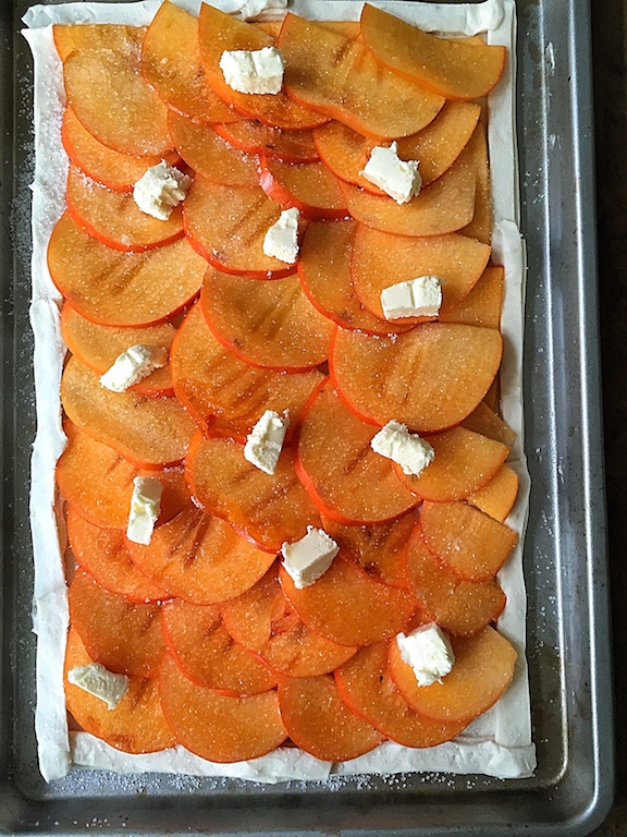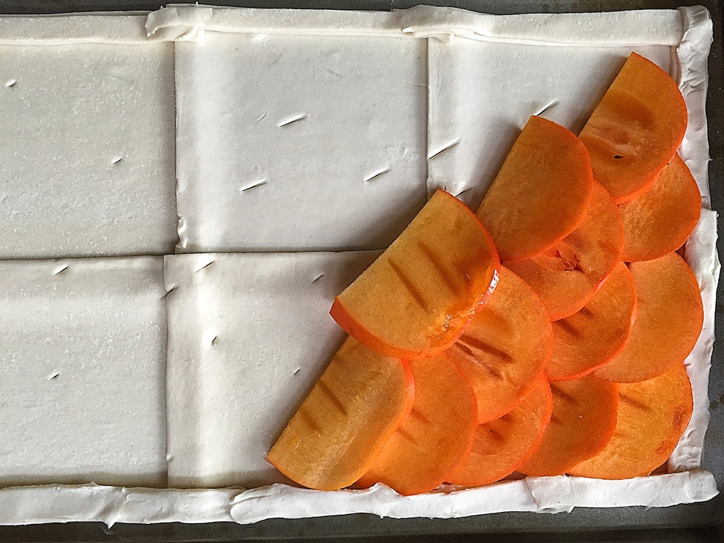 - Halveer de Kaki en snij ze in mooie plakjes. Leg het fruit trapsgewijs op het bladerdeeg.